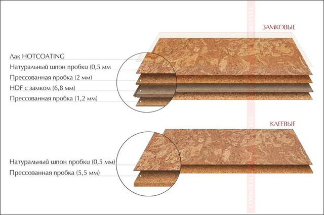 Клейову пробку ще називають корковим паркетом, тому що це масив спресованої пробки, зверху декорований шпоном пробкової кори, натуральною шкірою, сланцем або цифровий фотодруком.